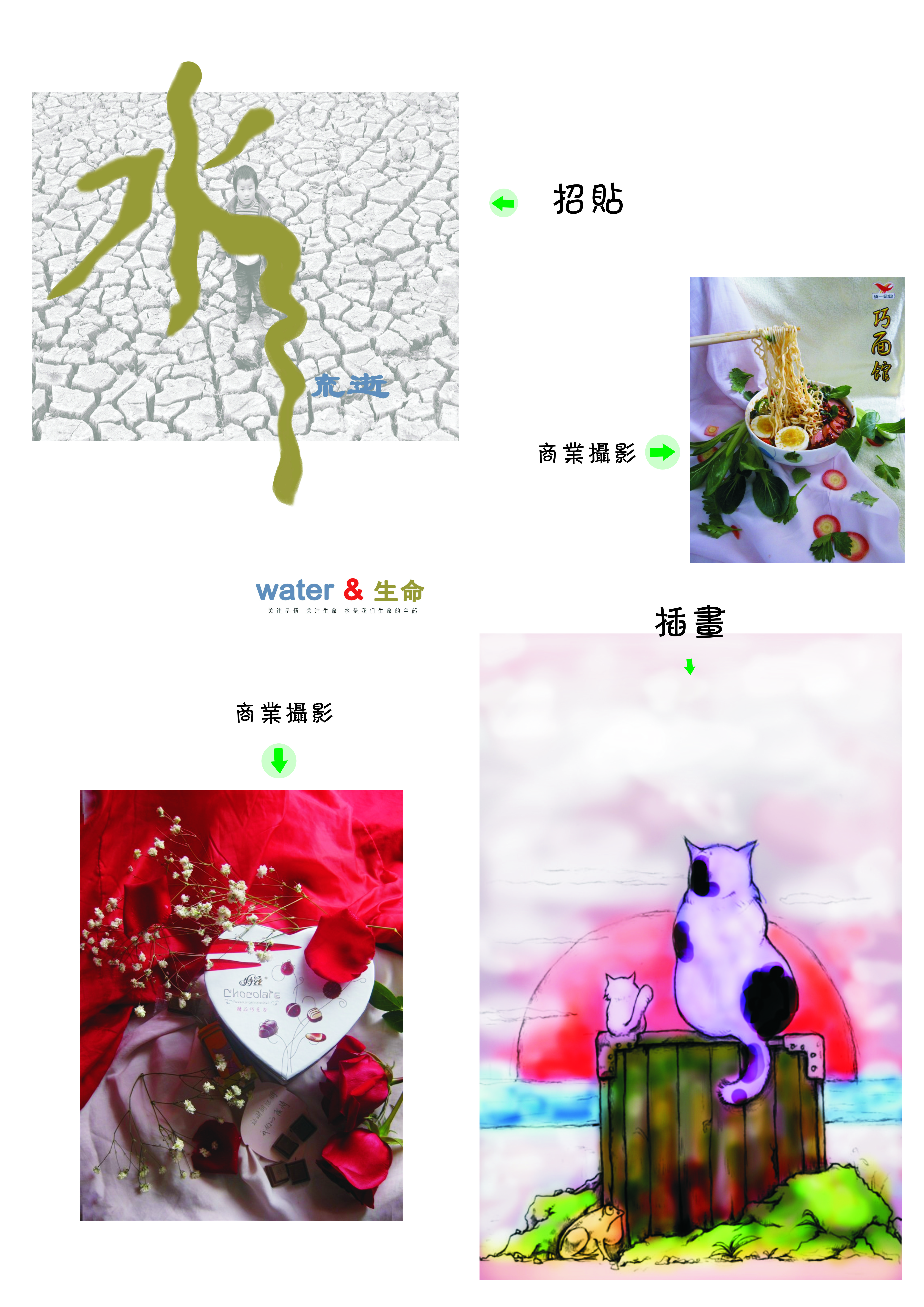 文化招貼,商業(yè)攝影,還有自己用PS練習(xí)的插畫(huà)。 |